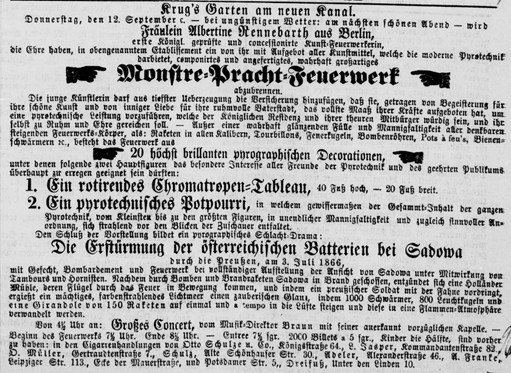 Am 12. September 1867 brennt Albertine Rennebarth ihr erstes öffentliches Feuerwerk in „Krug’s Garten" am Berliner Landwehrkanal (damals: „Neuer Kanal") ab. Eine Großanzeige in der Vossischen Zeitung kündigt sie explizit als „erste königlich geprüfte und concessionirte Kunst-Feuerwerkerin" an. Hauptattraktion des Feuerwerks ist eine etwa zwölf Meter hohe rotierende Konstruktion, die vermutlich einer Kombination aus Kaleidoskop und Feuerwerksrad gleicht. Nachgestellt wird außerdem die Schlacht von Sadowa, bei der Preußen ein Jahr zuvor siegreich aus dem Deutsch-Deutschen Krieg gegen Österreich und seine Verbündeten hervorgegangen war. Zeitgenössische Berichte loben die Inszenierung insbesondere hinsichtlich der „lieblichen Farben" und „prachtvollen Schwärmer". Ihr Debüt verschafft Albertine Rennebarth erste Anerkennung in Fachkreisen und bestätigt sie darin, die Feuerwerkerei professionell weiterzuverfolgen.