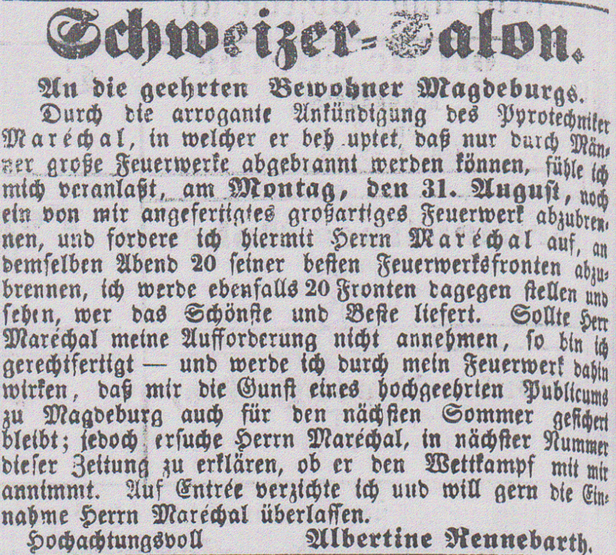 Eine Vielzahl von Zeitungsberichten aus der zweiten Hälfte des 19. Jahrhunderts zeugen vom Erfolg der Albertine Rennebarth in der Ausübung ihrer pyrotechnischen Profession. Bis zum Beginn des Deutsch-Französischen Krieg im Mai 1870 sind rund 40 ihrer Feuerwerke in Magdeburg dokumentiert. Hier erreicht Albertine den Status einer lokalen Berühmtheit. Der Ausruf „Albertine, noch ’ne Jrine!" [Albertine, noch eine grüne (Rakete)!] ist bei ihren Feuerwerken im Schweizer Salon/Konzerthaus, im Herrenkrug, dem Friedrich Wilhelms-Garten anderen Festplätzen allgegenwärtig. Sie engagiert sich für soziale Belange, indem sie regelmäßig Benefiz-Feuerwerke durchführt, deren Erlös Waisenhäusern oder Hinterbliebenen von Soldaten zugutekommt.