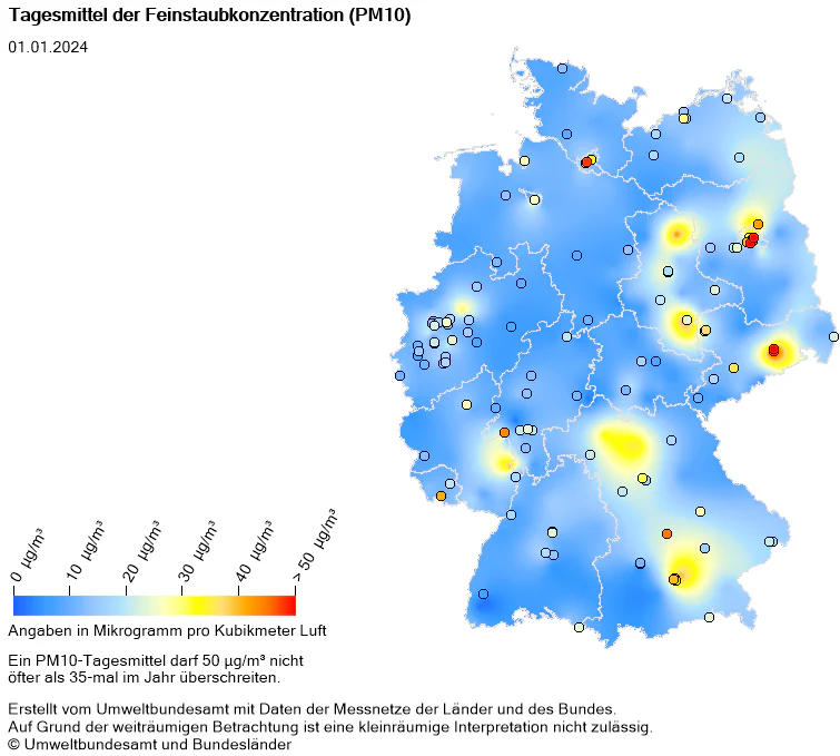 Der Grenzwert für den Tagesdurchschnitt von 50 µg/m³ wurde an lediglich fünf Stationen (3 in Berlin, 2 in Dresden) überschritten. Bei rund 360 Stationen entspricht dies weniger als 2%. Die an diesen Stationen gemessenen Überschreitungen des Grenzwerts kommen durch die Konzentrationsspitzen in den ersten Stunden des Jahres zustande (siehe oben). Eine über 24 Stunden konstante Exposition gegenüber Feinstaubkonzentrationen von mehr als 50 µg/m³ hat an keinem Ort bestanden.