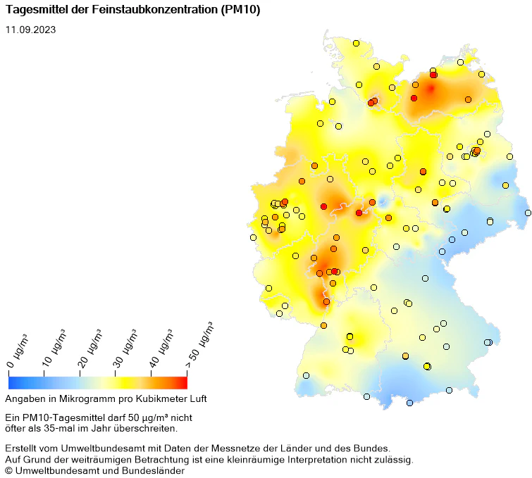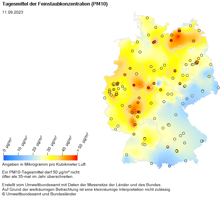 Die Zahl der Stationen mit erhöhten Werten über 50 µg/m³ lag um 01:00 Uhr bei 196 von rund 350 und sank bis um 06:00 Uhr auf null. Mit Ausnahme von nur drei Stationen war gute Luftqualität, hier definiert als Konzentrationen von weniger als 35 µg/m³, bereits eine Stunde später auch flächendeckend wiederhergestellt (s. unten).