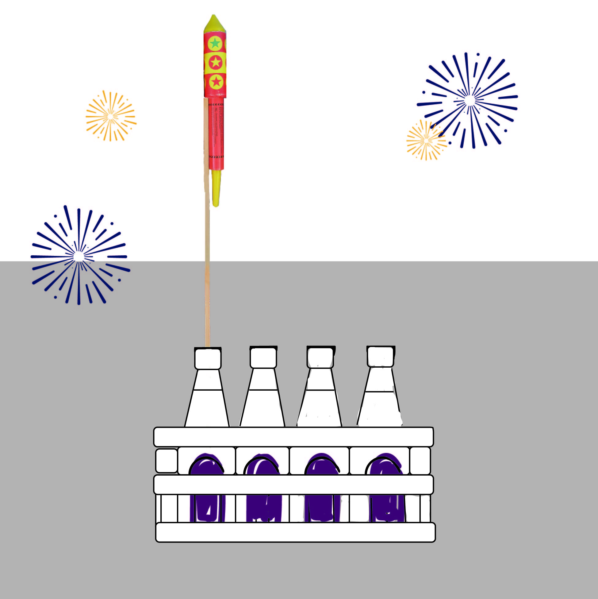 Achte beim Zünden von Batteriefeuerwerk auf einen ebenen, festen Untergrund (z.B. Straße) und sichere den Feuerwerkskörper beidseitig gegen Umkippen. Manche Batterien haben Papplaschen, die ausgeklappt werden können. Raketen in alleinstehenden Flaschen können kippen. Zünde Raketen daher am besten aus einer fest stehenden Getränkekiste.