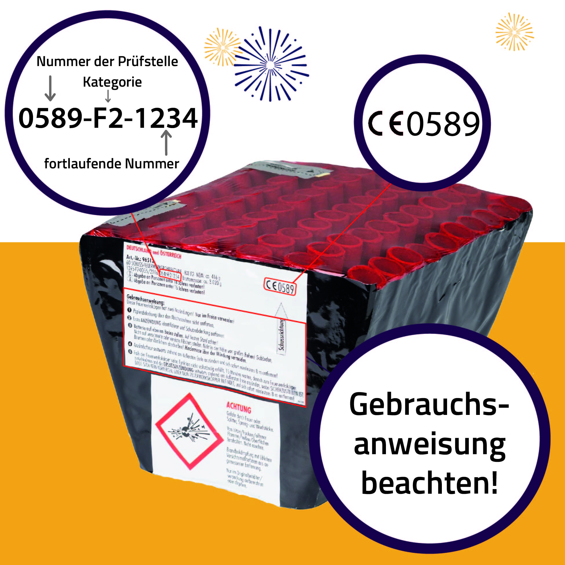 Kaufe ausschließlich zugelassenes und geprüftes Silvesterfeuerwerk. Dies ist erkennbar an: Dem CE-Zeichen gefolgt von der Nummer der Prüfstelle (z.B. CE 0589) sowie an der Registriernummer (z.B. 0589- F2-1234). Jeder Feuerwerkskörper hat unterschiedliche Sicherheits- und Anwendungshinweise. Lies dir diese vor dem Zünden sorgfältig durch.