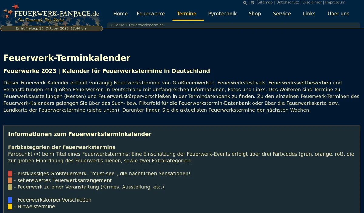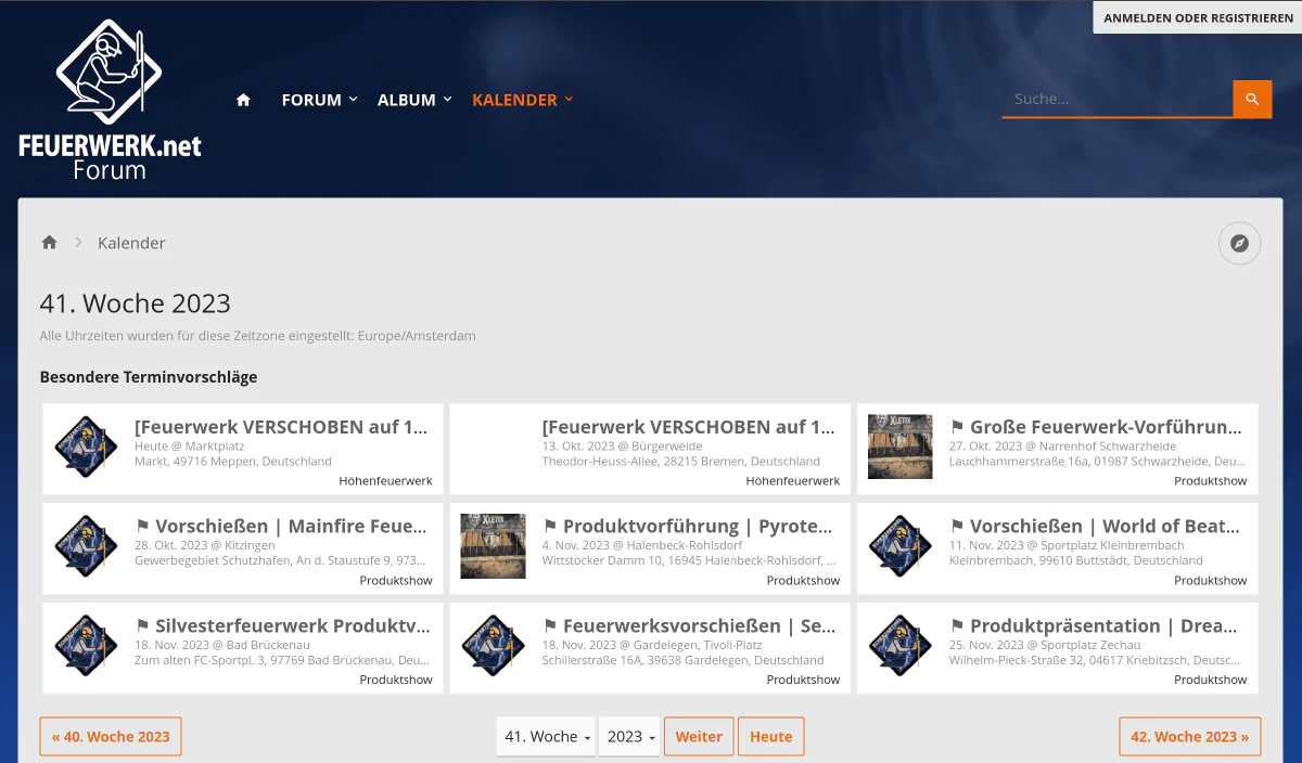 Du möchtest Dir ein professionelles Feuerwerk in Deiner Nähe anzuschauen? Mehrere Webseiten aus der Feuerwerks-Community führen öffentliche Kalender über anstehende Feuerwerksveranstaltungen. Wenn Du ein Feuerwerk in Deiner Umgebung anschauen möchten, empfehlen wir, auf folgenden zwei Seiten vorbeizuschauen: